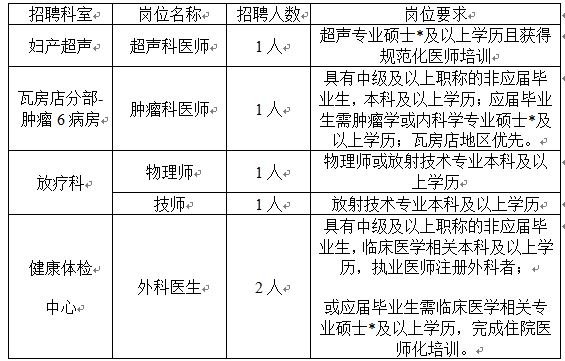 4. 考核:考核工作分为面试和用人科室试工(1-2周)两部分。面试及试工所需交通费及住宿费自理。考核时间、地点等信息,我院将电话另行通知。