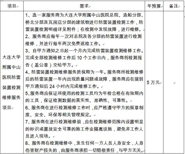 为充分调研大连大学附属中山医院关于防雷装置检测维修服务项目市场情况,我院拟对下列服务进行市场调研。欢迎能提供此服务的服务商与我院参与现场调研。