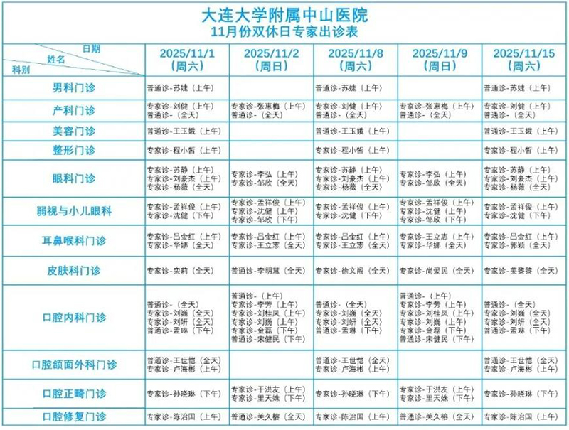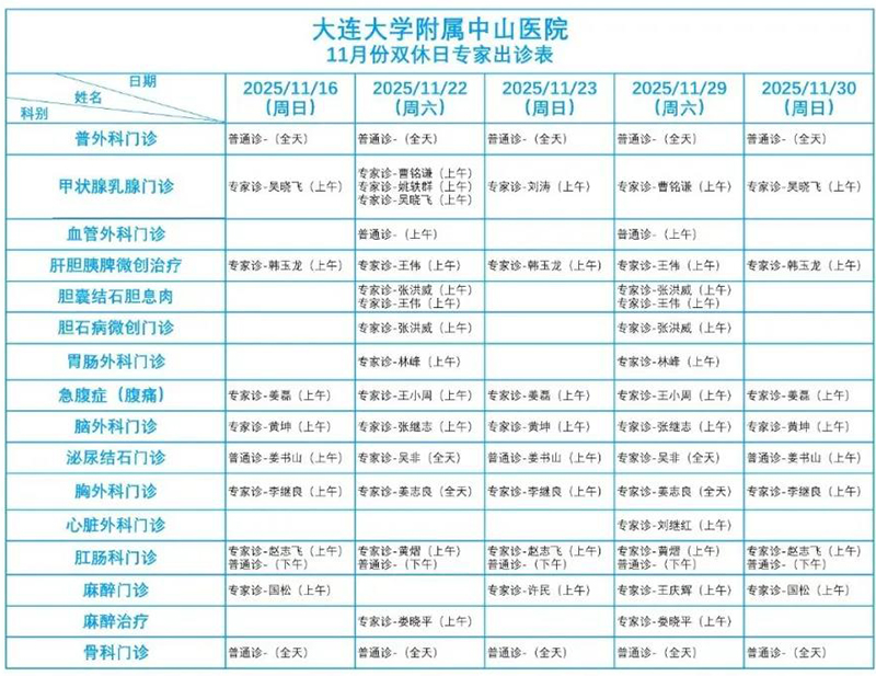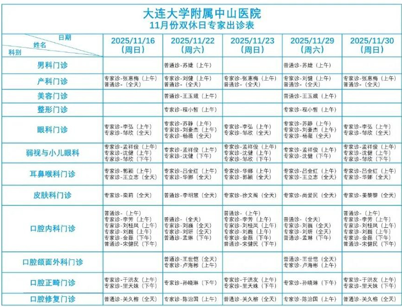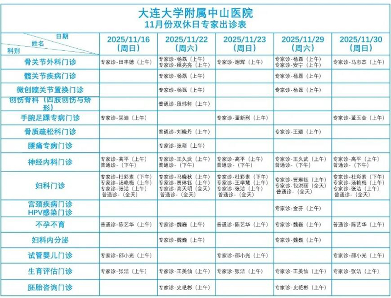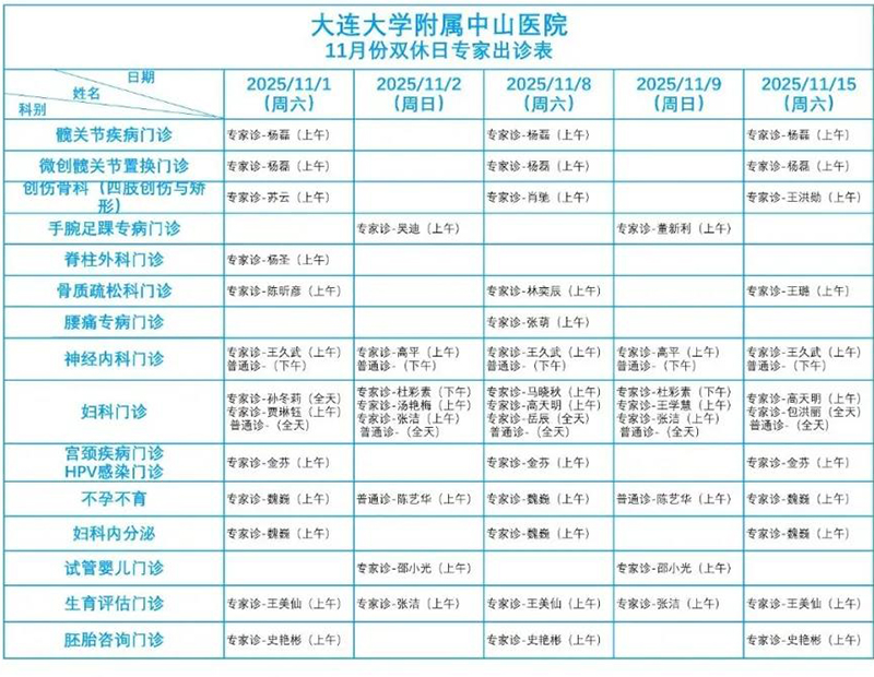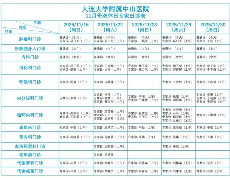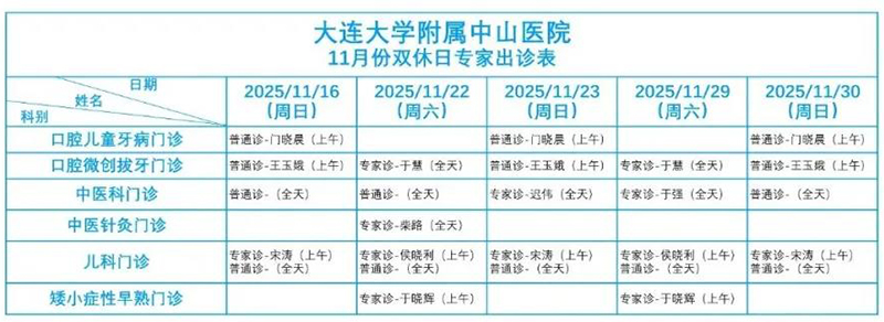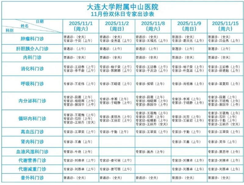 医院继续推行“无假日医院”服务模式,现将十一月份双休日出诊科室及出诊专家表公示如下: