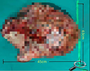 2025年10月16日,于患者而言是新生活的开始,手术在邹忠文教授、张洁主任团队、循环三科于勤主任,泌尿外科姜丰泽主任医师及麻醉二科、护理团队的共同努力下如期进行。术中确认肿瘤来源于后腹膜,巨大肿瘤压迫盆腹腔导致解剖结构改变,暴露腹主动脉非常困难,创面很大……团队根据术前制定的周密方案,从容应对,历时5个小时,成功切除了肿瘤,肿瘤大小达63cm×45cm,重约20kg。