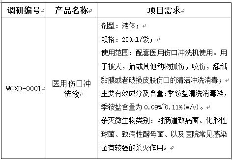 为充分调医用伤口冲洗液市场供给及使用情况,我院拟对医用伤口冲洗液行市场调研,欢迎能提供此类产品的厂家或经销商参与现场调研。