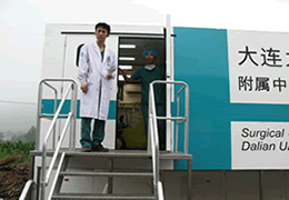 大连庄河市仙人洞镇三架山乡坐落在四周环山的大山沟里,乡卫生院医疗条件相对落后,既没有手术室,也没有可以做手术的专业医生。2012年7月21日,医院10余人的医疗小分队随远程医疗监护手术急救一体车奔波250公里来到三架山乡卫生院。医生们在手术车上成功完成两台大隐静脉高位结扎剥脱手术和一台脂肪瘤切除手术,这是医疗手术车接到并完成的“首个任务 ”。